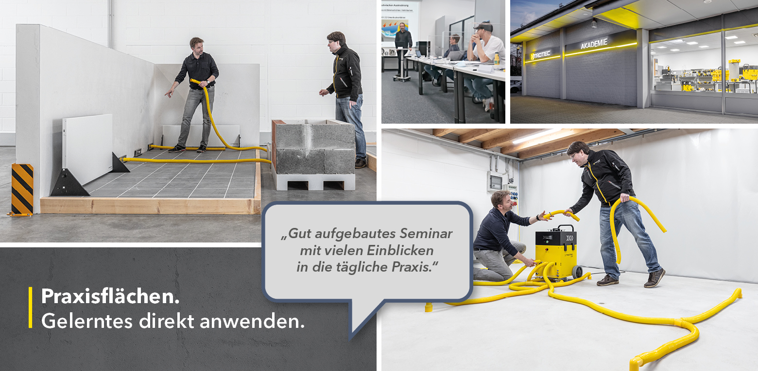Unsere Praxis-Flächen im Profi-Center laden dazu ein, das Gelernte direkt auszuprobieren und anzuwenden. Ob zerstörungsfreie Ortung eines Wasserrohrbruchs, professionelle Dämmschichttrocknung oder fachgerechte Schimmelsanierung – wir haben für unterschiedliche Anwendungsbereiche Simulationsräume geschaffen, in denen reale Anwendungsfälle ausprobiert werden können. So verinnerlichen die Seminarteilnehmer das Gelernte mit allen Sinnen und sind fit für ihre beruflichen Herausforderungen.