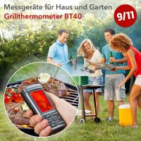 Ob Rind, Lamm, Kalb, Hamburger, Schwein, Fisch, Pute oder Huhn – acht verschiedene Lebensmittel lassen sich zubereitungsgerecht mit bis zu fünf Garstufen von leicht bis gut durchgegart am Empfänger vorwählen. Dabei sind die jeweils voreingestellten Ziel-Temperaturen individuell variierbar. Der Messfühler und das Kabel des BT40 sind beide aus Edelstahl und eignen sich für Temperaturen bis zu 200 °C. Die Ausstattung des Grill-Thermometers wird von Stoppuhr- und Timer-Funktion komplettiert.