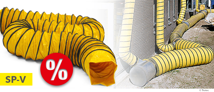 Die extrem leichten und flexiblen Standard-Lüfter-Spiralschläuche SP-V jetzt im Abverkauf! Insgesamt 9 verschiedene Größen stehen dabei zur Auswahl – mit einem Durchmesser von 155 mm bis zu 605 mm. Die Schläuche sind ideal geeignet zum Belüftungs- und Entlüftungseinsatz und im Verhältnis 1:10 stauchbar. Das PVC-beschichtete Polyamidgewebe ist robust und mit Stahlspiralen verstärkt, so dass sie gegen Abknicken geschützt sind. Ihren Einsatz finden die SP-V Schläuche besonders zur Be- und Entlüftung in der Klima- und Lüftungstechnik, im Messebau, bei Veranstaltungen oder bei der Bauten-Trocknung.