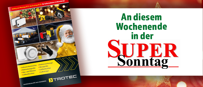 Die neue Trotec-Angebotsbeilage findet ihr dieses Wochenende in der SuperSonntag! Wir bieten auf 20 Seiten unschlagbare Sonderpreise, die nur in unserem Werksverkauf in Heinsberg von Montag 27.11 bis Freitag 01.12. erhältlich sind.