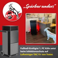 Zum Schutz der Spieler, Mitarbeiter und Gäste setzt der 1. FC Köln in seinem Vereinsheim mit angeschlossener Gastronomie sowie Event- und Tagungsräumen auf die wissenschaftlich nachgewiesene Schutzwirkung des Luftreinigers TAC V+ von Trotec. Wer sich zum Public Viewing im Vereinsheim einfindet, im lichtdurchfluteten Geißbockheim-Restaurant speist oder das Training auf dem Platz bei einem kühlen Kölsch verfolgt, der kann sich sicher sein – hier fliegen keine Viren in der Luft!