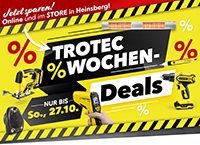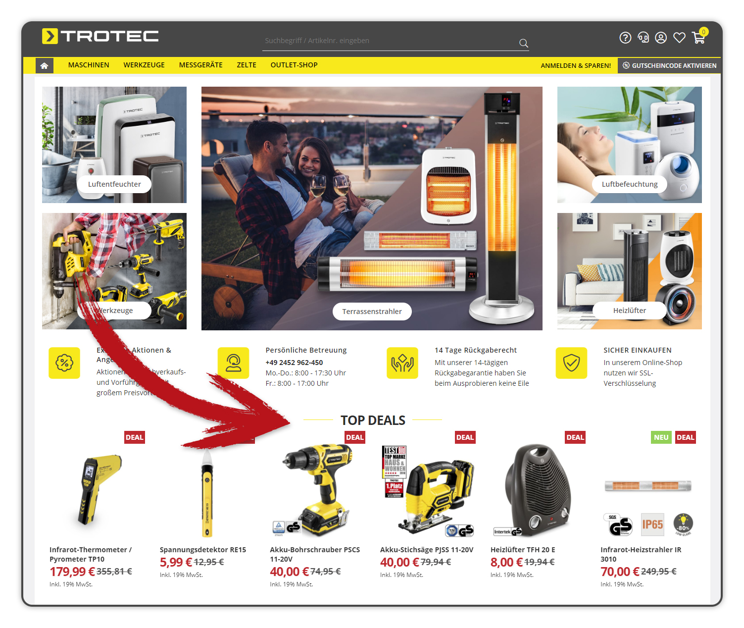 Auf unserer Startseite im Online-Shop de.trotec.com/shop werden Ihnen alle „TOP DEALS“ angezeigt. Navigieren Sie einfach mit den Pfeilen nach „rechts“ und „links“ und Sie finden alle aktuellen Deals.