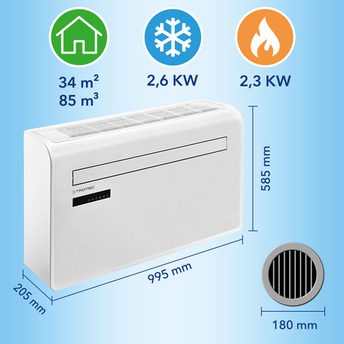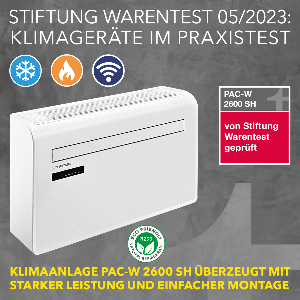 Im Test von Stiftung Warentest widerlegt das Monoblock-Wandgerät PAC-W 2600 Sh die landläufige Meinung, dass nur Klimageräte mit Außeneinheit besonders effizient kühlen bzw. heizen. Wer eine leistungsfähige Klimaanlage mit hoher Effizienz sucht, die nicht die Hausfassade mit einem klobigen Kasten verschandelt oder für deren Einbau in die Wohnung nicht erst ein Genehmigungsmarathon durchlaufen werden muss, wird bei Trotec fündig.
