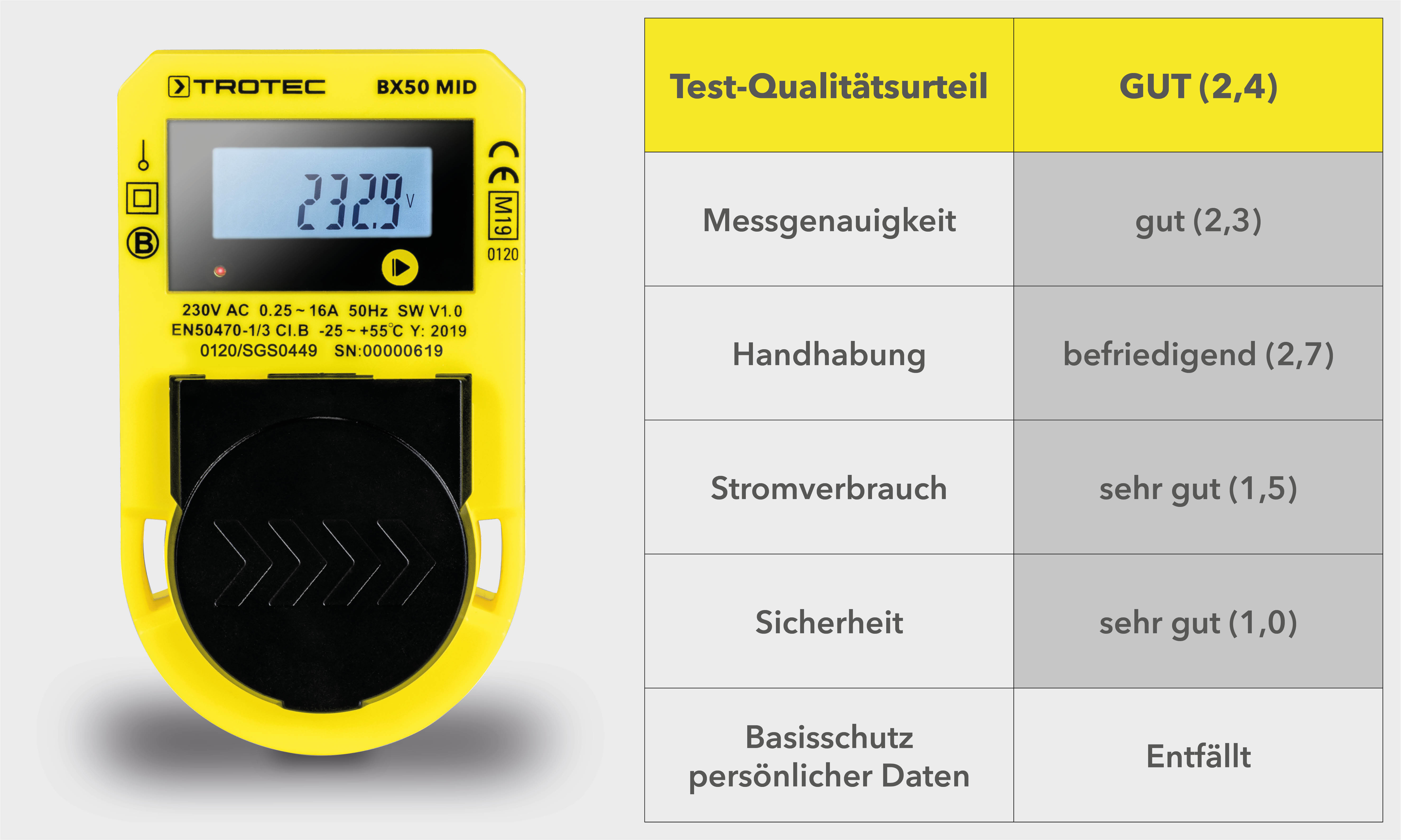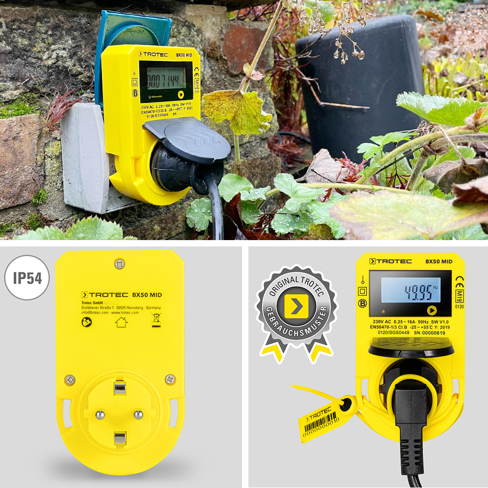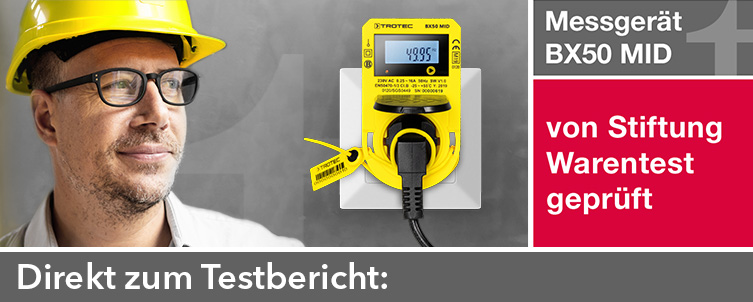 Mit im Testfeld: Das Strommessgerät BX50 MID von Trotec, das als einziges Gerät im Test selbst professionellen Ansprüchen gerecht wird und dank MID-Konformität (nach EN50470-1/3 ) sogar zur gewerblichen Energieverbrauchsermittlung eingesetzt werden kann.