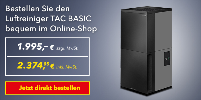 Den Einstieg in die hochwirksame TAC Hochleistungsluftreinigung, zum Schutz vor SARS-CoV-2-Viren in der Luft, eröffnet die neue Modellvariante 2021 unseres bewährten TAC BASIC – als perfekte Mischung aus wissenschaftlich bestätigter Wirksamkeit, H14-HEPA-Virenfilterung und individuellem ökonomischen Anspruch. Kompakte H14-Hochleistungsluftreiniger, die preislich attraktiv, mobil einsetzbar und energiesparend sind, stehen in der Käuferkunst weit vorn. Mit einer konsequenten Weitentwicklung des TAC BASIC tragen wir dieser Entwicklung im Bereich der mobilen Hochleistungsluftreinigung noch stärker Rechnung.