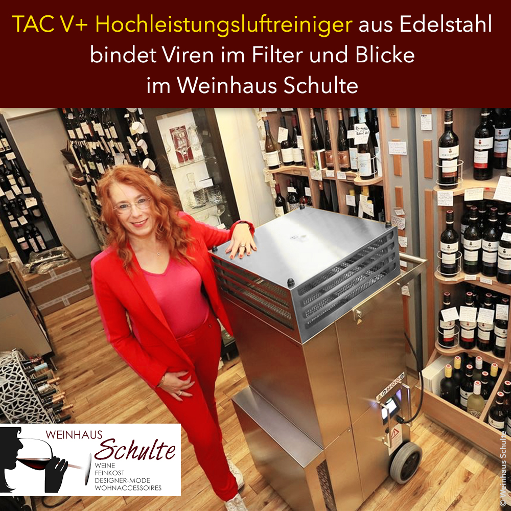 Nicole Schulte weiß, wie sie ihre Kunden überzeugen und in ihren Bann ziehen kann. Wer das Weinhaus Schulte in Kamen betritt, dessen Blicke bleiben zwangsläufig an der zeitlos eleganten Skulptur aus Edelstahl hängen, die sich erst beim zweiten Blick als ein TAC V+ Hochleistungsluftreiniger in hochwertiger Edelstahlausführung zu erkennen gibt. Der massive aber zugleich elegante Raumluftreiniger ist ein echter Blickfang im gemütlich eingerichteten Laden für Weine, Feinkost und Wohnaccessoires, in dem auch regelmäßige Wein-Events stattfinden.