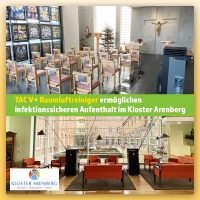 Die Gefahr, dass sich die Kloster-Gäste bei Einhaltung aller Sicherheits- und Hygienemaßnahmen (AHA-Regeln) über die Raumluft mit dem Coronavirus infizieren, sinkt durch den Einsatz der TAC V+ Raumluftreiniger erheblich! Infektiöse Aerosole aber ebenso weitere Krankmacher in der Luft werden zuverlässig und dauerhaft aus der Raumluft gefiltert, sodass sie nicht über die Atmung in den Körper aufgenommen werden.