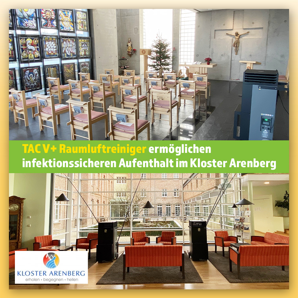 In allen Räumen des Klosters Arenberg, in denen sich Gäste aufhalten, sorgen nun mobile und individuell positionierbare TAC V+ Hochleistungsluftreiniger für eine 99,995 % virenfreie Raumluft. Die Zahl der in einem Raum eingesetzten Geräte hängt im Wesentlichen vom Raumluftvolumen und der Nutzungsintensität ab. So kommen beispielsweise in den Speiseräumen aufgrund der Größe und der hohen Nutzerzahl mehrere Geräte zum Einsatz. Die Gästekapelle und der Meditationsraum, die aufgrund der behördlich vorgeschriebenen Hygienekonzepte während der Pandemie nicht mit einer hohen Gästezahl genutzt werden können, erhielten jeweils einen Raumluftreiniger.