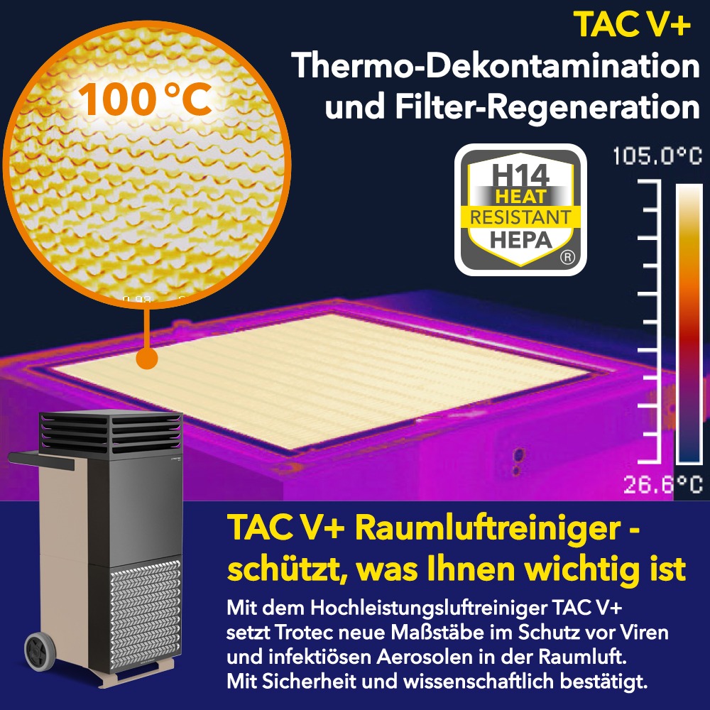 Um eine Anreicherung der Viren im Filter zu verhindern und der Gefahr vorzubeugen, dass die abgeschiedenen Viren durch eine unsachgemäße Bedienung (beispielsweise im unbeaufsichtigten Betrieb in Schulen oder öffentlichen Bereichen) erneut in die Raumluft gelangen, kommt im TAC V+ ein neuartiger H14-Heat-Resistant-HEPA®-Filter (99,995 % Abscheidegrad, zertifiziert nach EN 1822) zum Einsatz. Dieser von Trotec entwickelte Spezialfilter wird regelmäßig auf 100 °C erhitzt, um Viren und Keime zuverlässig abzutöten. Nur so kann kein infektiöses Virus aus dem Filter erneut in die Umgebungsluft gelangen. Durch die thermische Dekontamination des Filters wird sichergestellt, dass das Gerät nicht selbst zur „Virenschleuder“ wird.