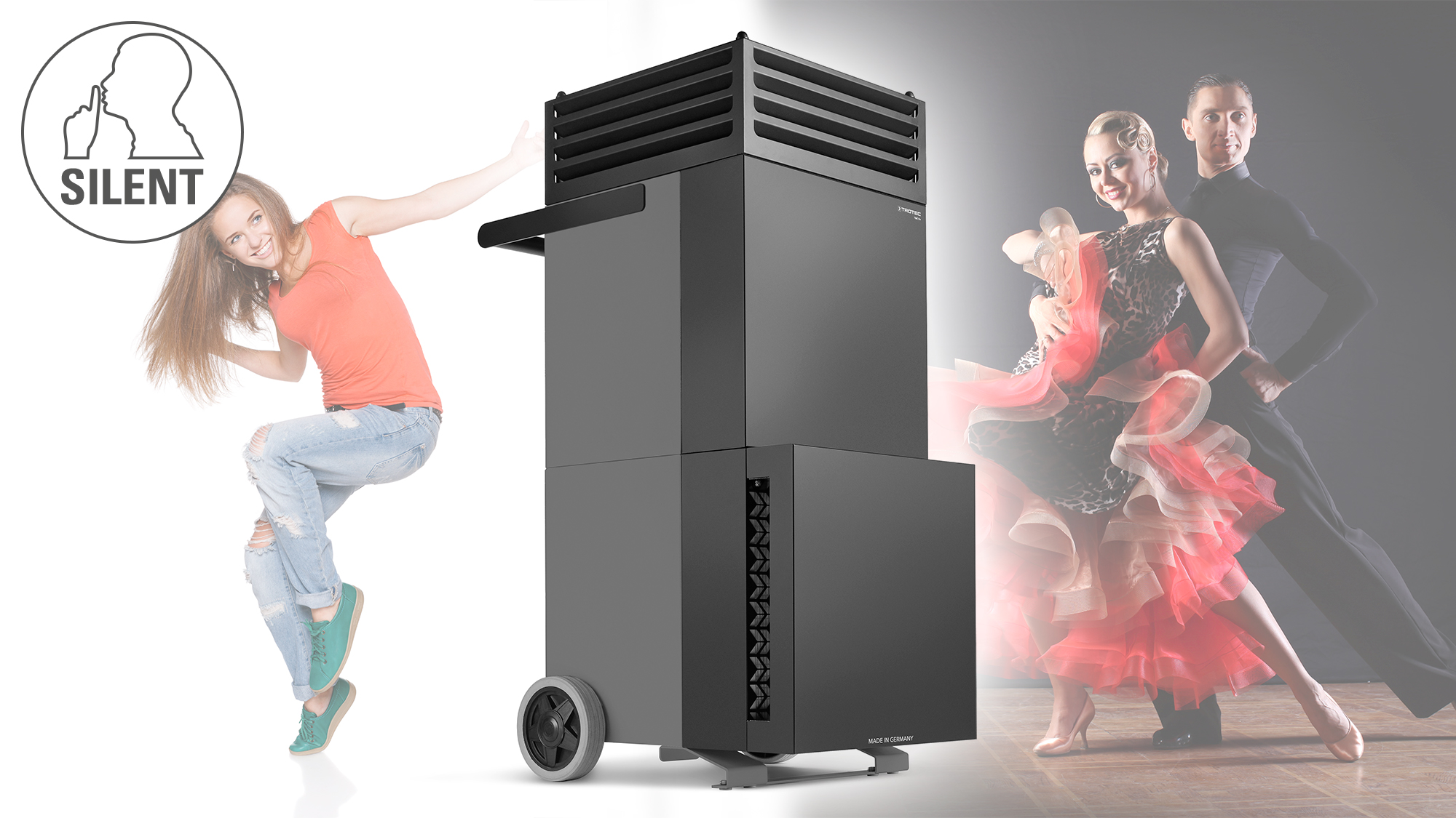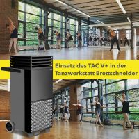 Virenbehaftete Aerosole in den Tanzräumen werden unmittelbar nach der Freisetzung durch hygienisch saubere Reinluft verdünnt, angesaugt und die darin enthaltenen Viren im speziellen H14-HEPA-Filter thermisch abgetötet. Partikelmessungen der Universität der Bundeswehr München belegen, dass der Luftreiniger TAC V+ die Aerosolkonzentration in einem 80 qm großen Raum innerhalb von 6 Minuten halbiert. In kleineren Räumen benötigt der Hochleistungsluftreiniger sogar nur 3 Minuten für eine Halbierung der luftgetragenen Virenlast.