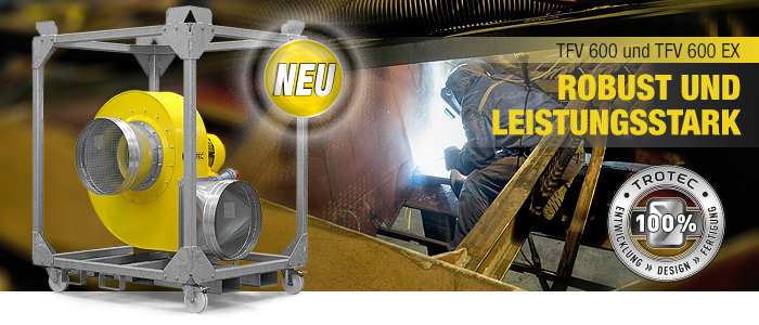 Die mobilen Ventilatoren der TFV-Serie sind für vielfältigste Einsätze geeignet, bei denen ein Lufttransport über lange Distanzen notwendig ist. Die in Deutschland hergestellten Radialventilatoren sorgen für die richtige Belüftung: sowohl für den Arbeitsschutz als auch für das Arbeitsklima. Neu im Sortiment ist der TFV 600 mit einer Luftmenge von bis zu 16.000 m³/h. Für den Einsatz in Ex-Schutzzonen ist der TFV 600 Ex neu im Programm.
