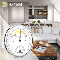 Das Thermohygrometer BZ15M ist mit einer hochwertigen Messmechanik ‚Made in Germany‘ ausgestattet, die wartungsfrei eine Messgenauigkeit von ± 3 % rel. F. im Bereich 20 bis 100 % relativer Feuchte garantiert. Mittels dieser Mechanik wird die Längenänderung einer speziell vorbehandelten synthetischen Faser gemessen, die sich bei Feuchte ausdehnt und bei Trockenheit zusammenzieht. Die Längenänderung wird mit Hebel und Achsen in eine Drehbewegung umgesetzt und durch den Zeiger übermittelt. Die Anzeige des Hygrometers kann durch eine Nullpunkt-Korrektur ganz einfach berichtigt und kalibriert werden.