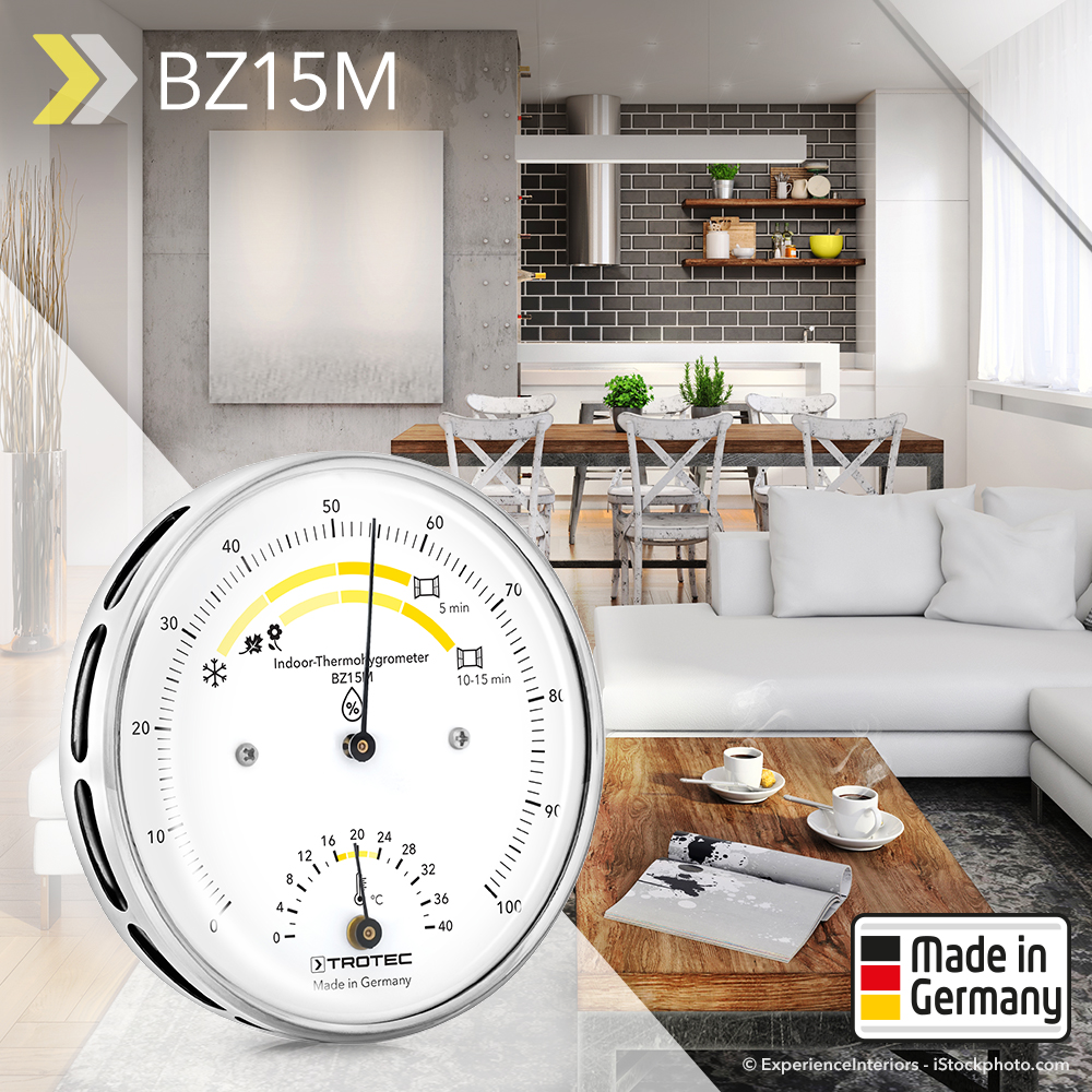 Im Sommer ist in Innenräumen eine höhere Luftfeuchtigkeit erlaubt als im Winter. Doch wann ist auch da die Toleranzgrenze überschritten? Wann wird es kritisch im Hinblick auf eine mögliche Gesundheitsgefährdung? Das wieder lieferbare Thermohygrometer BZ15M beantwortet diese Fragen – zuverlässig, präzise und auf einen Blick leicht ablesbar. Es zeigt sommers wie winters die Klimawerte wie Raumtemperatur und relative Luftfeuchte in Innenräumen in ihrer Abhängigkeit von der Jahreszeit und gibt zugleich die jeweils optimale Lüftungsdauer vor.