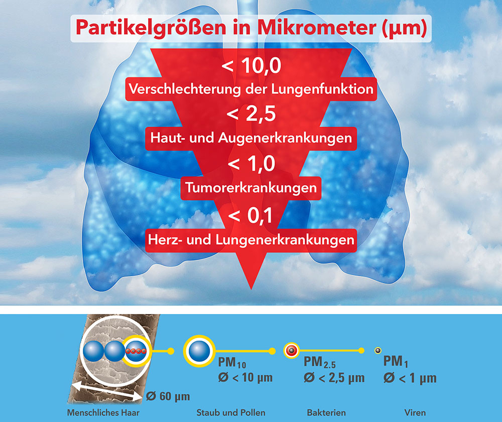 Hohe Feinstaubkonzentration sind in vielen Städten keine Seltenheit. Diese lungengängigen Kleinstpartikel gelten gerade für ältere Menschen – eine wichtige Zielgruppe des stationären Buchhandels – als besonders gesundheitsschädlich. Je kleiner diese Feinstaubpartikel sind, desto tiefer können sie in den Körper eindringen. In Bronchien und Lunge lösen Feinstaubpartikel Entzündungen aus, weitere Folgen von Feinstaub sind Herzinfarkte, Schlaganfälle sowie eine beschleunigte Arteriosklerose. Zudem gibt es eine Korrelation zwischen hoher Feinstaubbelastung und dem erhöhten Risiko, an COVID-19 zu sterben. Wissenschaftler der Oxford Universität haben berechnet, dass durchschnittlich 15 Prozent der weltweiten Corona-Todesfälle darauf zurückzuführen sind, dass die Opfer über einen längeren Zeitraum schmutzige Luft eingeatmet haben.