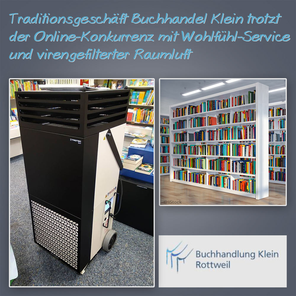 In der Buchhandlung Klein hingegen können die Kunden zukünftig ganz unbesorgt einkaufen. Ohne Blick auf die Uhr und ohne sich um eine Ansteckung mit dem SARS-CoV-2-Virus fürchten zu müssen. Möglich macht dies ein TAC V+ Hochleistungsluftreiniger, der neueste Mitarbeiter im Service-Team. Das mobile Gerät filtert 99,995 % aller Viren und Schadstoffe aus der Luft. Das Risiko einer indirekten Ansteckung sinkt dadurch nahezu auf null. Natürlich gelten trotz Luftreiniger weiter die AHA-Regeln (Abstand halten, Hygiene beachten und Maske tragen) in der Buchhandlung. Jedoch schützen diese Maßnahmen nur vor der direkten Schmier- und Tröpfcheninfektion mit dem Coronavirus. Nicht aber vor den virenbehafteten Aerosolen in der Raumluft, die nach einhelliger Meinung aller Experten als Hauptüberträger des Coronavirus gelten.