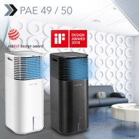 Mit dem klassisch weißen PAE 49 und/oder dem elegant schwarzen PAE 50 – beide übrigens für ihre stilvolle Gehäusegestaltung mit dem renommierten ‚Red Dot Design Award‘ und dem ‚IF Design Award‘ ausgezeichnet – haben Sie die Wahl zwischen technisch baugleichen Modellen. Sie profitieren also bei beiden Geräten auf jeden Fall von den komfortablen 4-in-1-Funktionen: wohltuende Luftbefeuchtung und effektive Luftreinigung nach dem Ionisationsprinzip, angenehme Luftkühlung und belebende Lufterfrischung. Jetzt im Herbst und Winter empfehlen sich die Geräte als effektive Luftbefeuchter um ein angenehmeres Raumklima zu schaffen und das Übertragungsrisiko von Viren zu reduzieren. Und im Frühling und Spätsommer können Sie mit ihren 4 Ventilationsstufen für frischen Wind sorgen und die kühlende Wirkung der Kaltverdunstung genießen. Denn unsere mobilen Aircooler funktionieren nach dem Prinzip der natürlichen Verdunstungskühlung.