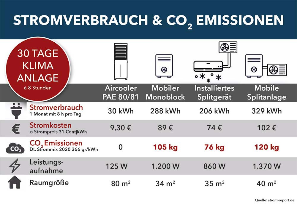 Im direkten Stromvergleich wird deutlich, wie günstig ein Trotec-Aircooler mit Wasserfüllung die Raumtemperatur im Vergleich zu klassischen Klimaanlagen mit Kühlmitteln abkühlt: