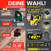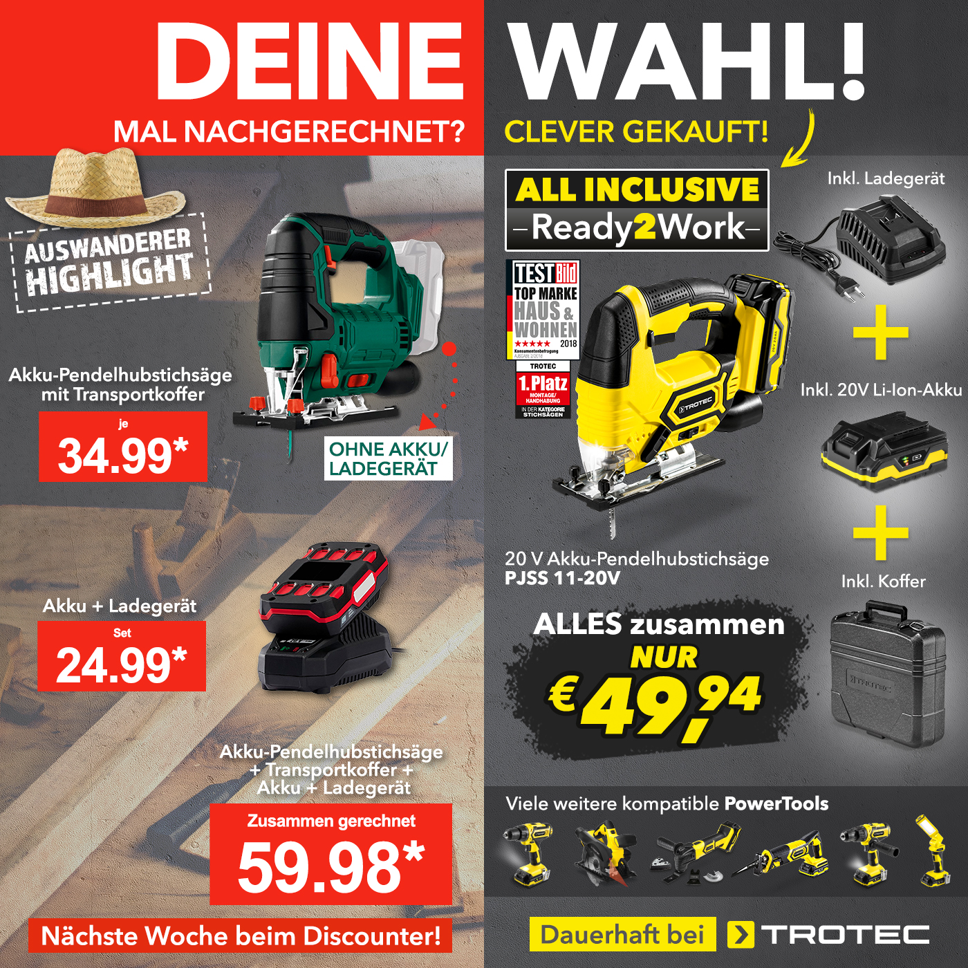 Beim Discounter gibt es nächste Woche eine Akku-Stichsäge als Sonderangebot. Wenn man zusätzlich noch den Akku oder sogar auch ein Ladegerät mit dazu kaufen muss, ist der Discounter-Preis direkt teurer als bei Trotec.