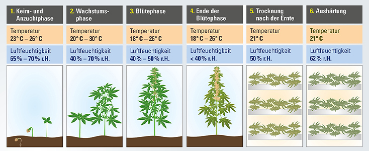 Generell lassen sich die Wachstumsphasen von Cannabispflanzen in vier verschiede Stadien unterteilen, in denen jeweils unterschiedliche Temperatur- und Luftfeuchteverhältnisse für eine bestmögliche Entwicklung erforderlich sind. Am Anfang benötigen die Klone – so werden die zur Zucht von der Mutterpflanze abgeschnittenen Stecklinge genannt – bei Tageslicht bzw. Beleuchtungslicht eine Umgebungstemperatur zwischen 20°C – 25°C und eine relativ hohe Luftfeuchtigkeit von 65 – 70 Prozent. Während der Vegetationsperiode liegt der Bedarf an Luftfeuchtigkeit zwischen 40 – 70 Prozent bei einer Raumtemperatur von 22°C bis 28°C. In der darauffolgenden Blüteperiode muss die Luftfeuchtigkeit unbedingt auf ein Niveau zwischen 40 – 50 Prozent reguliert werden und die Temperatur sollte 26°C nicht mehr überschreiten – ideal ist eine Raumwärme zwischen 20°C und 26°C. In der Spätblütephase – ca. ein bis zwei Wochen vor der Ernte – muss die Luftfeuchtigkeit weiter gesenkt werden auf 30 – 40 Prozent bei einer Raumtemperatur von nur noch 18°C bis 24°C.