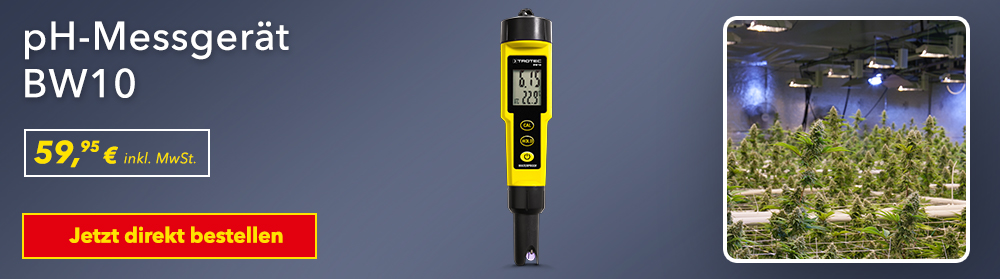 Das Anbaumedium für Hanfpflanzen kann aus ganz unterschiedlichen Substraten bestehen: Steinwolle oder Steinwollwürfel, Kokosfaser, Perliten, einem Hydroponik-System oder einem selbst hergestellten Erde-Kompost-Gemisch. Hauptsache die Pflanzen werden gut mit Wasser, Sauerstoff und Nährstoffen versorgt. Je nach Ausgangssubstrat muss die Pflanze jedoch entsprechend gedüngt werden – und ganz wichtig: Der pH-Wert des Nährmediums muss regelmäßig überprüft werden. Ein leicht saures Milieu im Wurzelbereich ist für die Cannabispflanze optimal, weil dann alle notwendigen Nährstoffe aus dem Anbausubstrat aufgenommen werden können. Allerdings ist der perfekte pH-Bereich auch abhängig von der Anbaumethode: Während Pflanzen im Erdreich einen pH-Wert zwischen 6,5 – 7,5 bevorzugen, darf der pH-Wert bei einer Aufzucht auf Kokosfasern oder in einer Hydroponik-Anlage gerne etwas saurer sein und im Bereich 5,5 – 6,5 liegen. Ist der pH-Wert zu hoch oder zu niedrig, kommt es zu Schwierigkeiten bei der Mineralstoffaufnahme, selbst wenn die verschiedenen Pflanzennährstoffe in ausreichenden Mengen vorhanden sind. Die Messung des exakten pH-Werts ist übrigens gar kein Problem und lässt sich ebenso schnell wie bequem mit dem kompakten pH-Messgerät BW10 von Trotec erledigen.
