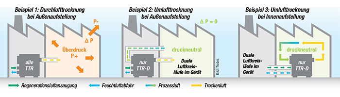 Ein praktisches Detail für den stationären Industrieeinsatz, insbesondere bei verrohrter Installation mit vorgegebener Standpositiondes Gerätes, ist die konfigurierbare Luftumkehr der größeren TTR-Aggregate. Hier lässt sich die Luftrichtung per einfacher Modulumkehr innerhalb des Gerätes bedarfsgerecht auf die betrieblichen Abläufe anpassen, sodass die Trockenluft rechts- oder linksseitig ausgeblasen und die Feuchtluft entsprechend gegengesetzt abgeführt werden kann. Zur optimalen Anpassung der Geräte auf die spezifischen Einsatzanforderungen steht außerdem ein umfassender Katalog mit einer Vielzahl von Zusatzausstattungen zur Verfügung.“