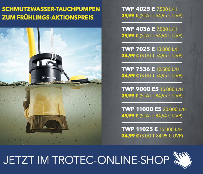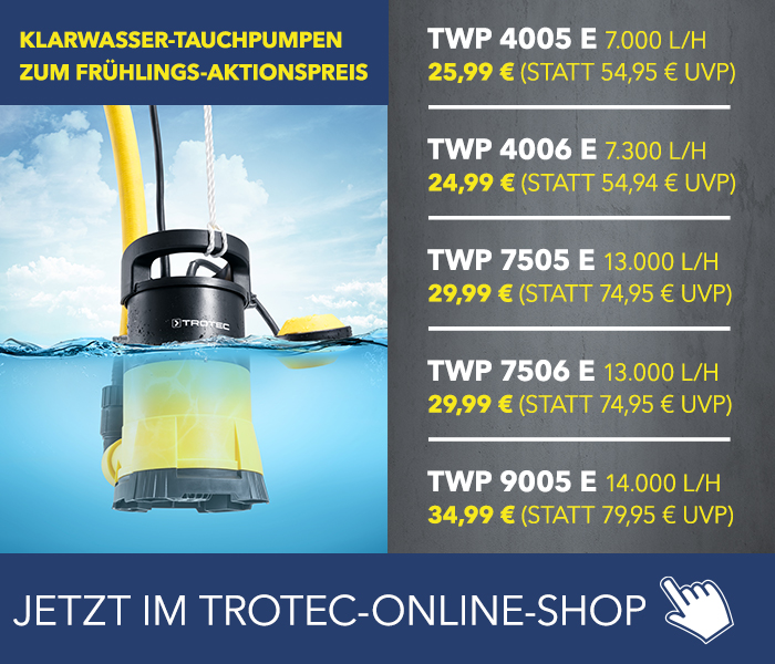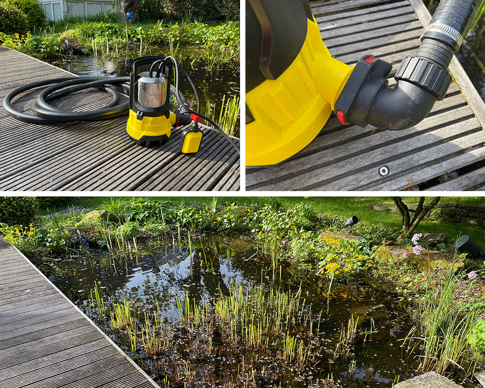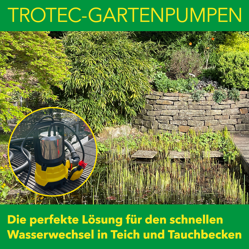 Ist im Frühjahr das Wasser im Gartenteich trüb oder grünlich, riecht es unangenehm oder weist das Wasser eine erhöhte Konzentration von Ammoniak oder Nitrit auf, ist es Zeit für einen teilweisen oder kompletten Wechsel des Wassers. Besonders schnell und einfach gelingt der Wasserwechsel mit Klarwasser- und Schmutzwasser-Tauchpumpen von Trotec, die mit ihren hohen Förderleistungen von bis zu 20.000 l/h sowohl den teilweisen Austausch des Wassers aber ebenso einen Vollwasserwechsel spürbar beschleunigen.