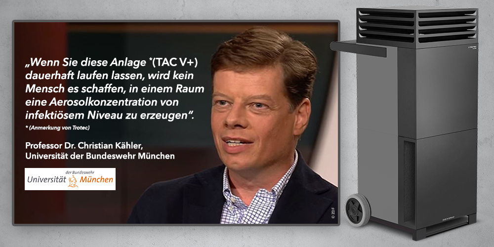 Professor Dr. Christian Kähler, Leiter des Instituts für Strömungsmechanik und Aerodynamik an der Universität der Bundeswehr München, empfiehlt – aus wissenschaftlicher Sicht – den Einsatz von mobilen TAC V+ Hochleistungsreinigern. Der Aerosolexperte, der ebenso wie Dr. Gerhard Scheuch seit mehr als 25 Jahren die Entstehung, Ausbreitung und Verdunstung von Aerosolen erforscht, hat die Wirksamkeit der Trotec-Luftreiniger in mehreren Studien untersucht. In seinen Bewertungen kommt Kähler zum Ergebnis: „Wenn Sie diese Anlage dauerhaft laufen lassen, dann wird kein Mensch es schaffen, in einem Raum eine Aerosolkonzentration von infektiösem Niveau zu erzeugen.“