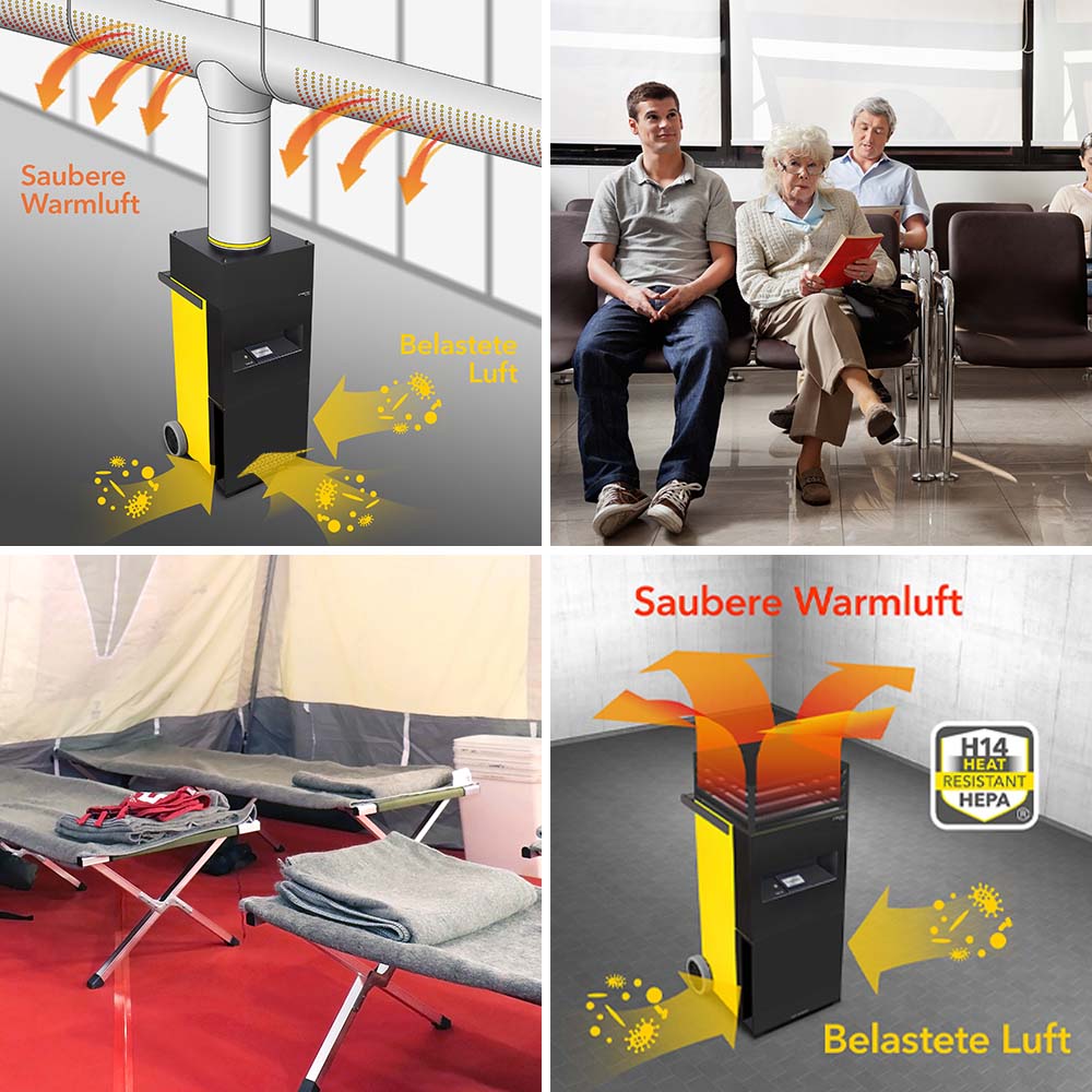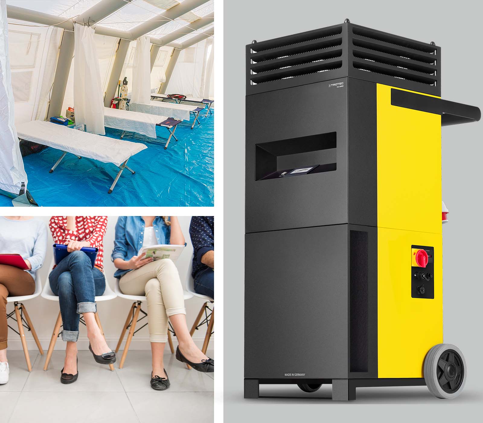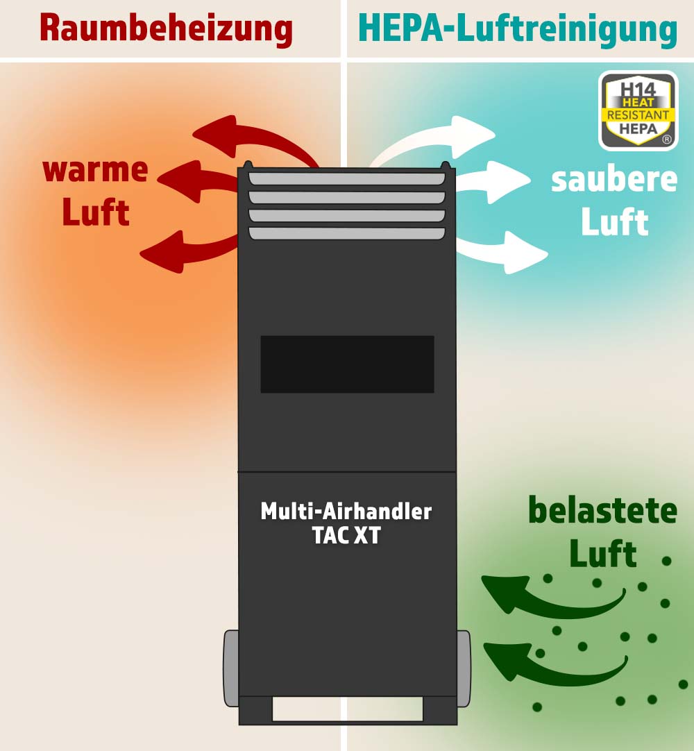 Damit empfiehlt sich der mobile Hochleistungsluftreiniger TAC XT mit integrierter Heizfunktion als einzigartige Lösung auf dem Markt, um gleichzeitig für virengefilterte Luft (H14-HEPA-Filtersystem nach EN 1822) und wohlige Wärme (18 oder 27 kW Heizleistung) in Aufwärmstationen oder Wärmehallen zu sorgen.