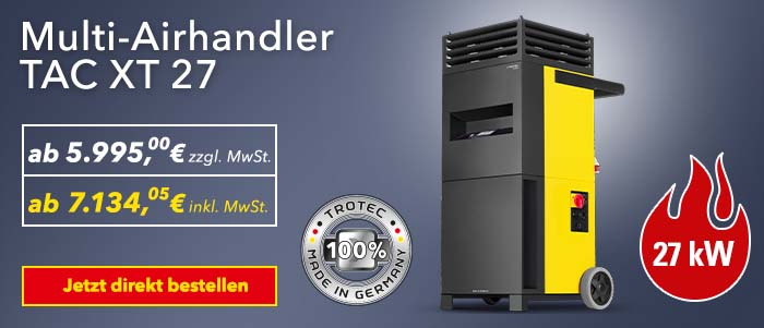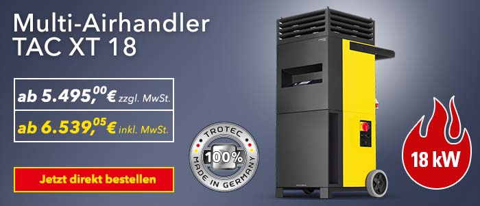 Entwickelt wurden die mobil einsetzbaren Hochleistungsluftreiniger der TAC-Serie, um in öffentlichen Bereichen und am Arbeitsplatz mit sauber gefilterter Raumluft einen hohen Schutz vor infektiösen Krankheitserregern wie dem SARS-CoV-2-Virus, Aerosolen, Bakterien und weiteren Luftschadstoffen zu ermöglichen. Die Anwendungsmöglichkeiten der Modelvariante TAC XT gehen jedoch weit über den Gesundheitsschutz hinaus. Ausgestattet mit einer 18 oder 27 kW starken Hochleistungs-Innenraumbeheizung stellt der TAC XT zugfreie Warmluft mit 360°-Wirkradius im gesamten Raum bereit und kann zudem zum Anschluss eines Gewebeluftverteilers oder an Luftverteilsystemen genutzt werden.
