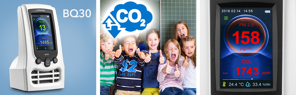 Mit dem praktischen Luftqualitätsmonitor BQ30 lassen sich Co²- und Partikelbelastung im Raum komfortabel im Blick behalten. Das BQ30 misst sowohl die Co²- Konzentration in der Raumluft und gibt den gemessenen Wert gut ablesbar mittels farbigen Bargraf-Indikator auf dem LCD-Display aus. Zudem misst das praktische Messgerät die Menge der Schwebstoffpartikel in der Raumluft und macht gefährlich hohe Konzentrationen unmittelbar sichtbar.