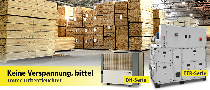 Der Haken dabei: Die Feuchte in der Luft schwankt je nach Jahreszeit. Ohne eine Regulierung sind Probleme vorprogrammiert. Zieht das Holz zu viel Feuchtigkeit aus der Luft, quillt es auf und verspannt sich. Ab einer Feuchte von 20 Prozent droht dazu Schimmel. Ist die Umgebungsluft zu trocken, gibt das Holz Feuchtigkeit ab und schrumpft förmlich. Sie wissen, wie viel Feuchtigkeit Ihr Produkt haben darf. Die Luftentfeuchter von Trotec sorgen dafür, dass Sie diese erreichen und vor allem konstant halten. Ob Kondenstrockner oder Adsorptionsprinzip – das hängt von der Größe und den Begebenheiten in Ihrem Lager ab. Sie entscheiden, und Trotec sichert die Qualität Ihres Holzes!