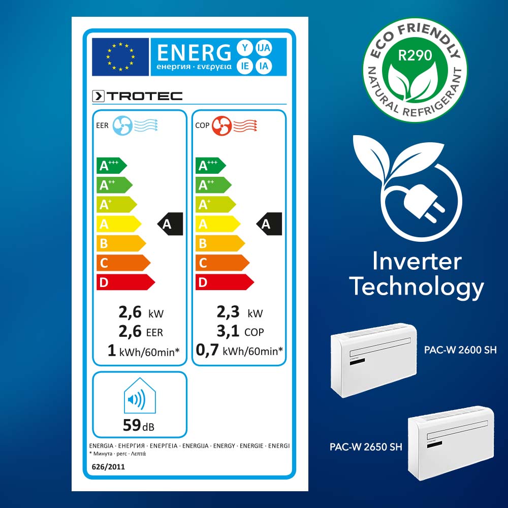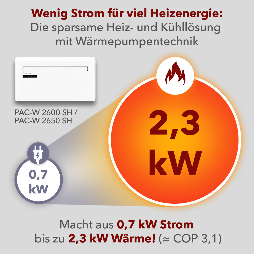 Gleichermaßen überzeugend ist der erfreulich niedrige Energieeinsatz im Heizbetrieb. Mit einem COP-Wert von 3,1 generieren die Luftwärmepumpen PAC-W 2600 SH und PAC-W 2650 SH aus 0,7 kWh Strom bis zu 2,3 kWh Wärme.