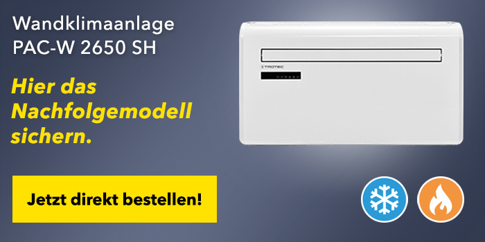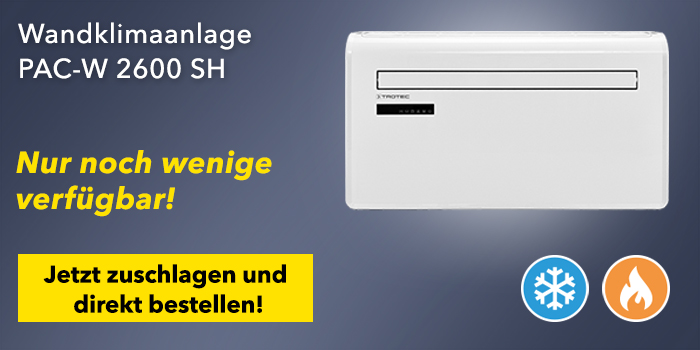 Die Luftwärmepumpen PAC-W 2600 SH und PAC-W 2650 SH sind aktuell zum Aktionspreis im Trotec-Online-Shop erhältlich. Sofort verfügbar und noch am Tag der Bestellung versandbereit.