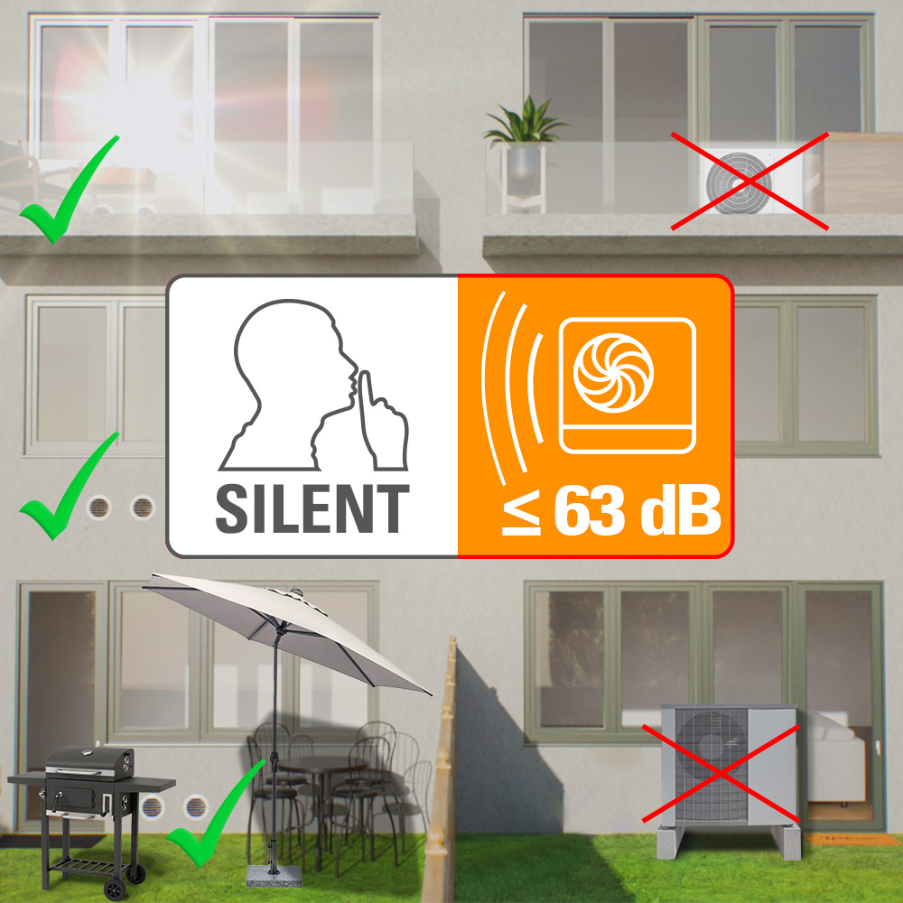 - Kein Zuglufteffekt im Raum dank Frischluftzufuhr von außen