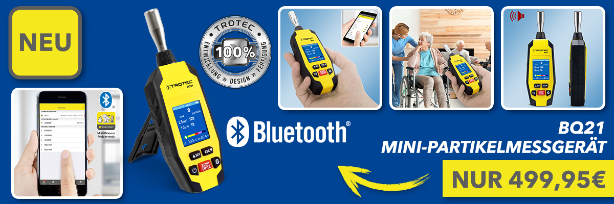 Mit dem smarten Bluetooth®-Handmessgerät BQ21 behalten Sie die Partikelbelastung der Umgebungsluft auch über längere Zeiträume im Blick. Das Partikelmessgerät mit einem Flash-Speicher für 5.000 Datensätze erfasst sämtliche gesundheitsrelevanten Raumklimaparameter wie Lufttemperatur, Luftfeuchtigkeit und Staubfraktionen < 10 Mikrometer nach dem international gebräuchlichen PM-Standard (Particulate Matter) als PM10 und PM2.5 (Anzahl und Größe sowie Massekonzentration von Partikeln in der Luft). Dargestellt wird die Luftbelastung auf dem 2,0 Zoll großen Farbdisplay wahlweise numerisch in Mikrogramm pro Kubikmeter (µg/m³) Raumluft oder als Partikelanzahl. Zusätzlich informiert ein Bargraph-Indikator per Farbbalken über den Status der momentanen Partikelbelastung
