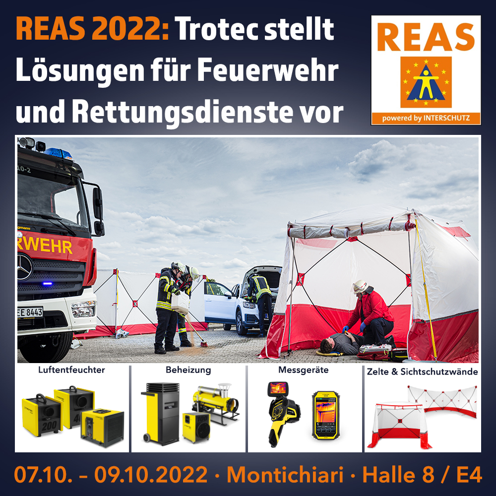 Vom 07. bis 09. Oktober 2022 präsentiert sich Trotec auf der italienischen Fachmesse REAS in Montichiari (Italien). Die REAS powered by INTERSCHUTZ ist die wichtigste Fachmesse für Rettung, Feuerwehr, Katastrophenhilfe und Sicherheit südlich der Alpen. Als namhafter deutscher Lösungsanbieter für Profi-Equipment stellen wir unsere innovativen Produkt-Highlights auf dem Messestand live vor. Die innovative Produktpalette reicht von Sichtschutzwänden/Arbeitszelten über mobile Heizgeräte/Klimageräte, mobile Luftentfeuchter bis hin zu mobilen Hochleistungsluftreinigern, Ozon-Desinfektoren, Messtechnik und Arbeitsleuchten. Treffen Sie unsere Experten in Halle 8, Stand E4 und lassen Sie uns gemeinsam Antworten und Lösungen für aktuelle und zukünftige Herausforderungen finden.