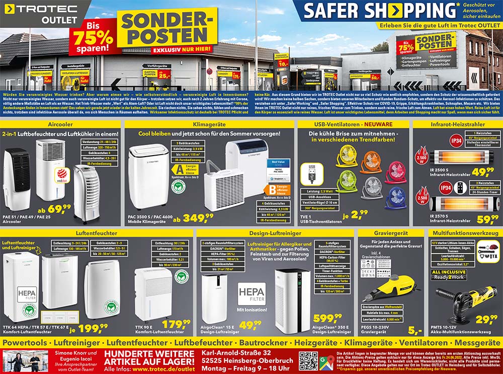 In unserem Trotec OUTLET bieten wir z. B. Ventilatoren, Klimageräte, Aircooler, Luftentfeuchter, Terrassen-Heizstrahler, Luftreiniger, Elektrowerkzeuge und vieles mehr schon ab 5,- € an! Natürlich wurden alle Versandretouren-Artikel und Vorführgeräte vorab von uns auf Herz und Nieren geprüft. So bekommen Sie einwandfreie Funktion zu stark vergünstigten Sonderpreisen.