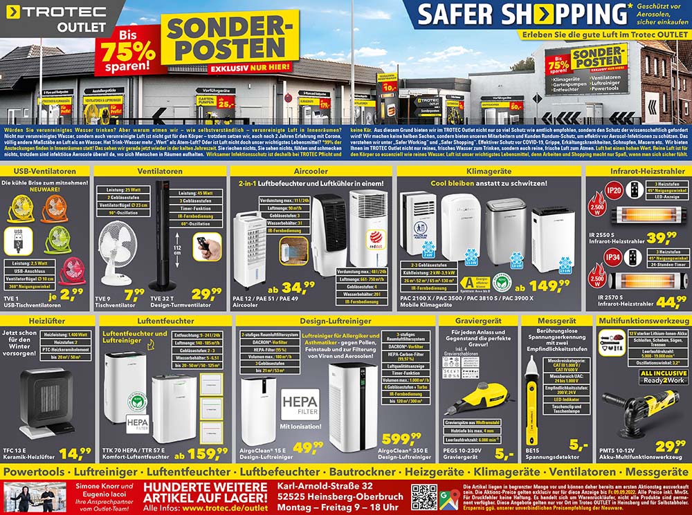 In unserem Trotec OUTLET bieten wir z. B. Ventilatoren, Klimageräte, Aircooler, Luftentfeuchter, Terrassen-Heizstrahler, Luftreiniger, Elektrowerkzeuge und vieles mehr schon ab 5,- € an! Natürlich wurden alle Versandretouren-Artikel und Vorführgeräte vorab von uns auf Herz und Nieren geprüft. So bekommen Sie einwandfreie Funktion zu stark vergünstigten Sonderpreisen.