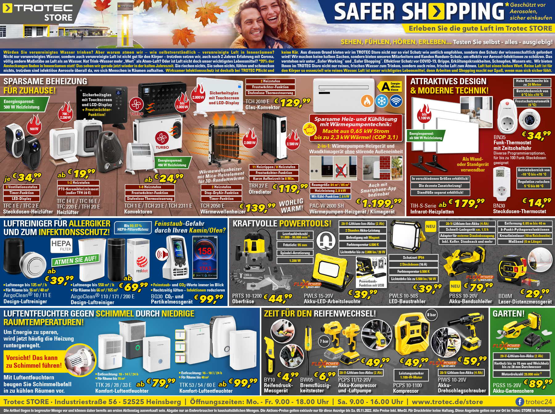 *Die Artikel liegen in begrenzter Menge vor und können daher bereits am ersten Aktionstag ausverkauft sein. Abgabe nur an Endverbraucher in haushaltsüblichen Mengen. Die Aktions-Preise gelten exklusiv nur für diesen Newsletter bis Sa. 05.11. und sind nur bei Trotec vor Ort in Heinsberg gültig.