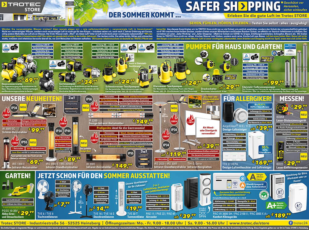 *Die Artikel liegen in begrenzter Menge vor und können daher bereits am ersten Aktionstag ausverkauft sein. Abgabe nur an Endverbraucher in haushaltsüblichen Mengen. Die Aktions-­Preise gelten exklusiv nur für diesen Newsletter bis Sa. 04.06. und sind nur bei Trotec vor Ort in Heinsberg gültig.