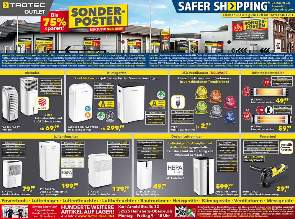 In unserem Trotec OUTLET bieten wir z. B. Ventilatoren, Klimageräte, Aircooler, Luftentfeuchter, Terrassen-Heizstrahler, Luftreiniger, Elektrowerkzeuge und vieles mehr schon ab 5,- € an! Natürlich wurden alle Versandretouren-Artikel und Vorführgeräte vorab von uns auf Herz und Nieren geprüft. So bekommen Sie einwandfreie Funktion zu stark vergünstigten Sonderpreisen.