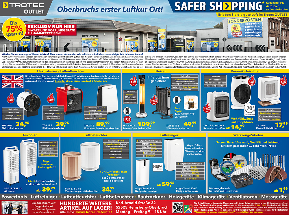 In unserem Trotec OUTLET bieten wir z. B. Ventilatoren, Klimageräte, Aircooler, Luftentfeuchter, Terrassen-Heizstrahler, Luftreiniger, Elektrowerkzeuge und vieles mehr schon ab 5,- € an! Natürlich wurden alle Versandretouren-Artikel und Vorführgeräte vorab von uns auf Herz und Nieren geprüft. So bekommen Sie einwandfreie Funktion zu stark vergünstigten Sonderpreisen.