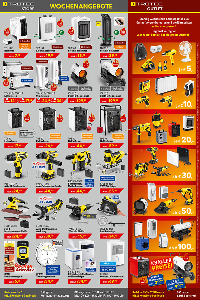 In unserem Trotec OUTLET bieten wir diese Woche Elektroheizer und Elektrowerkzeuge an.