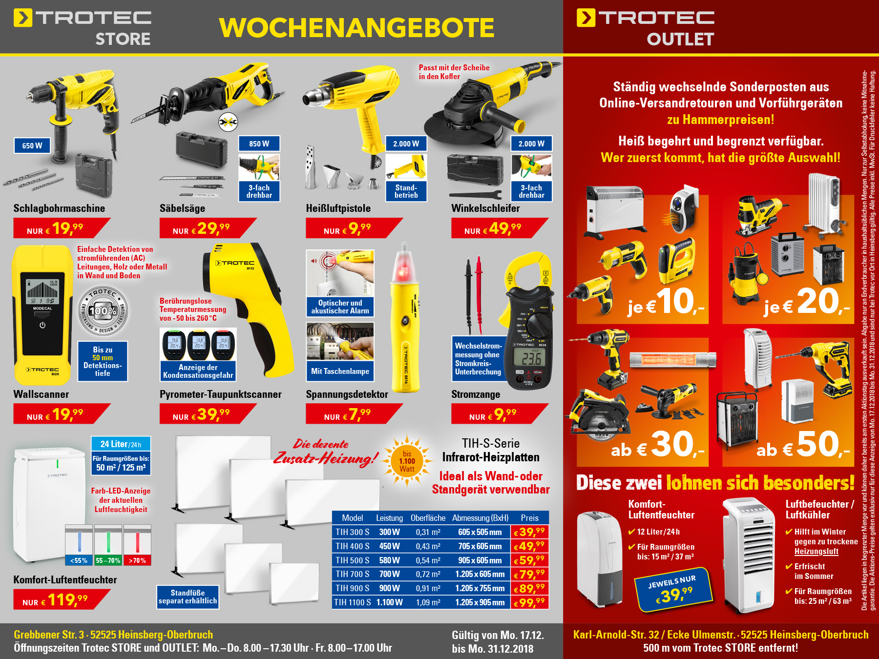 Unsere attraktiven Neuware-Schnäppchen bieten wir noch bis Montag, 31.12. bei uns im Trotec STORE in der Grebbener Straße 3 in Heinsberg-Oberbruch an.