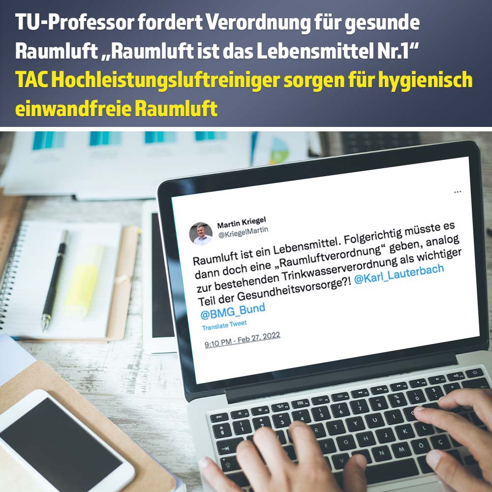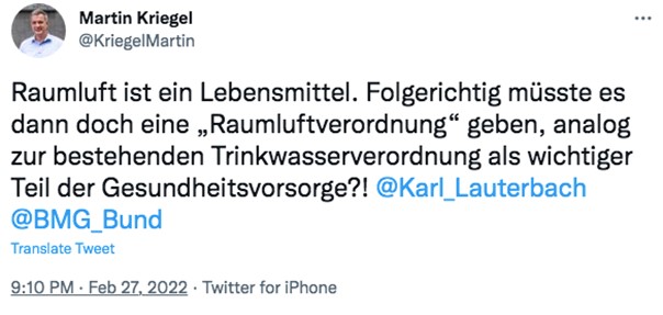 Dr.-Ing. Martin Kriegel, Professor an der TU-Berlin, weist auf Twitter zu Recht darauf hin, dass Raumluft ein Lebensmittel ist und es folgerichtig auch eine Raumluftverordnung geben müsse, »analog zur bestehenden Trinkwasserverordnung als wichtiger Teil der Gesundheitsvorsorge«. Adressiert ist der Tweet an Bundesgesundheitsminister Karl Lauterbach und das Bundesministerium für Gesund. »Wir nehmen ca. 15 kg Luft pro Tag zu uns und „nur“ 2 kg Wasser. Wir halten uns zu 90% der Zeit in Innenräumen auf. Raumluft ist das Lebensmittel Nr.1« erläutert Kriegel die Wichtigkeit der Raumluftkontrolle. Er plädiert für eine dauerhafte Kontrolle des #LebensmittelLuft durch geeignete Messtechnik und eine Verbesserung der Raumluftqualität durch technische Lösungen.