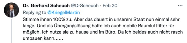 »Wir müssen in Zukunft wirklich für mehr Lufthygiene in den Innenräumen sorgen. Das sollte eine der Lehre aus der Corona Pandemie sein. Denn fast alle Infektionen fanden und finden drinnen statt.«, schreibt Scheuch und ergänzt: »Das verringert auch andere Atemwegsinfekte wie die saisonale Grippe.« Da die Nachrüstung bestehender Gebäude oder Räume mit RLT-Anlagen mit einem hohen Zeit- und Kostenaufwand verbunden ist, spricht sich Scheuch für mobile »Raumluftfilter als Übergangslösung« aus. Forschungsgesellschaften, Universitäten wie die Goethe-Universität in Frankfurt und allen voran die Universität der Bundeswehr München haben bereits sehr früh in der Corona-Pandemie die Wirksamkeit mobiler Hochleistungsluftreiniger getestet und deren Wirksamkeit zum Schutz vor einer Corona-Infektion wissenschaftlich fundiert belegt.