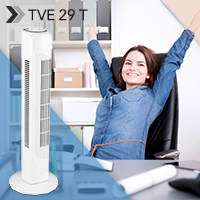 Der TVE 29 T erzeugt platzsparend über die Drehung einer Lamellenkonstruktion im Geräteinneren die Kühlung. Der anschließende Luftausstoß erfolgt über die gesamte Höhe des Turms. Die Einstellung der Ventilationsparameter erfolgt oberseitig am Gerät, wobei sich die Luftausblas-Geschwindigkeit je nach Raumtemperatur und gewünschter Windstärke in drei Geschwindigkeitsstufen steuern lässt. Die automatische 90°-Oszillation – das Schwenken des Luftstroms – sorgt für eine optimale Raumdurchlüftung. Dabei passt sich die Oszillation automatisch der gewählten Geschwindigkeitsstufe an.