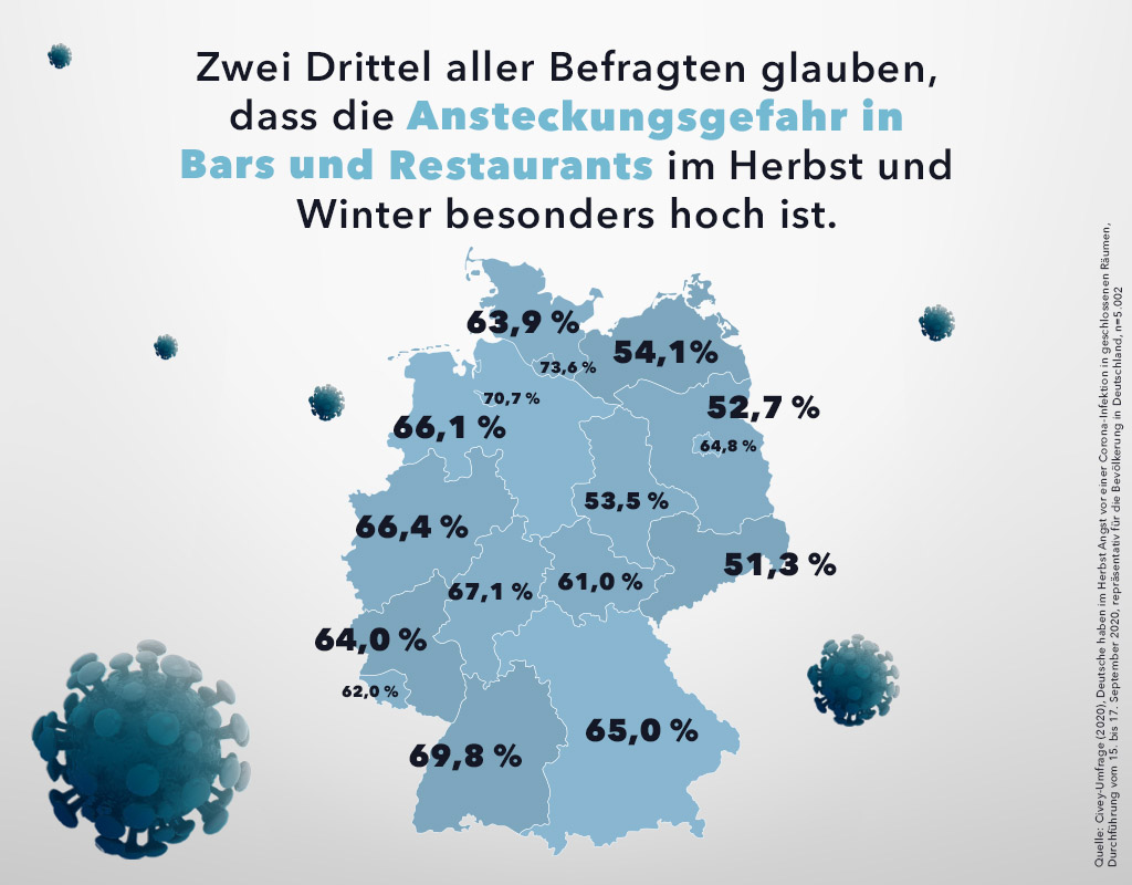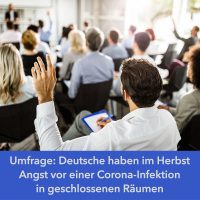 Der Sommer geht, die Sorge vor einer Ansteckung in geschlossenen Räumen bleibt. Und wird mit Blick auf den nahenden Herbst größer. Das zeigt eine aktuelle Umfrage des Meinungsforschungsinstituts Civey zum Thema „Corona-Schutz im Herbst“ im Auftrag von Trotec: Die Mehrheit der Deutschen hat Angst, sich in geschlossenen Räumen mit dem SARS-CoV-2-Virus zu infizieren. Besonders hoch schätzen die meisten der 5.000 Befragten das Risiko in Bars und Restaurants (63,4 Prozent) ein, gefolgt von Fitnessstudios, Sporthallen und Yoga-Studios (50 Prozent).