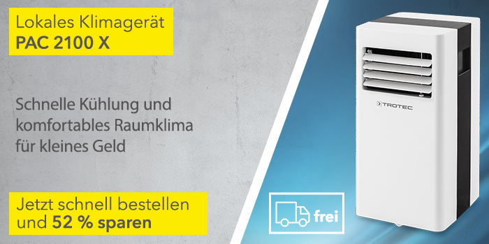 Dieses Trotec-Produkt erhalten Sie in TÜV-geprüfter Qualität als Garant für hohe Wertigkeit, Sicherheit und Funktionalität. Bestellen Sie deshalb am besten noch heute, denn das Klimagerät PAC 2100 X gibt es diese Woche versandkostenfrei zum Knallerpreis für nur 189,95 € inkl. MwSt. anstatt 399,95 €. Jetzt direkt sichern!