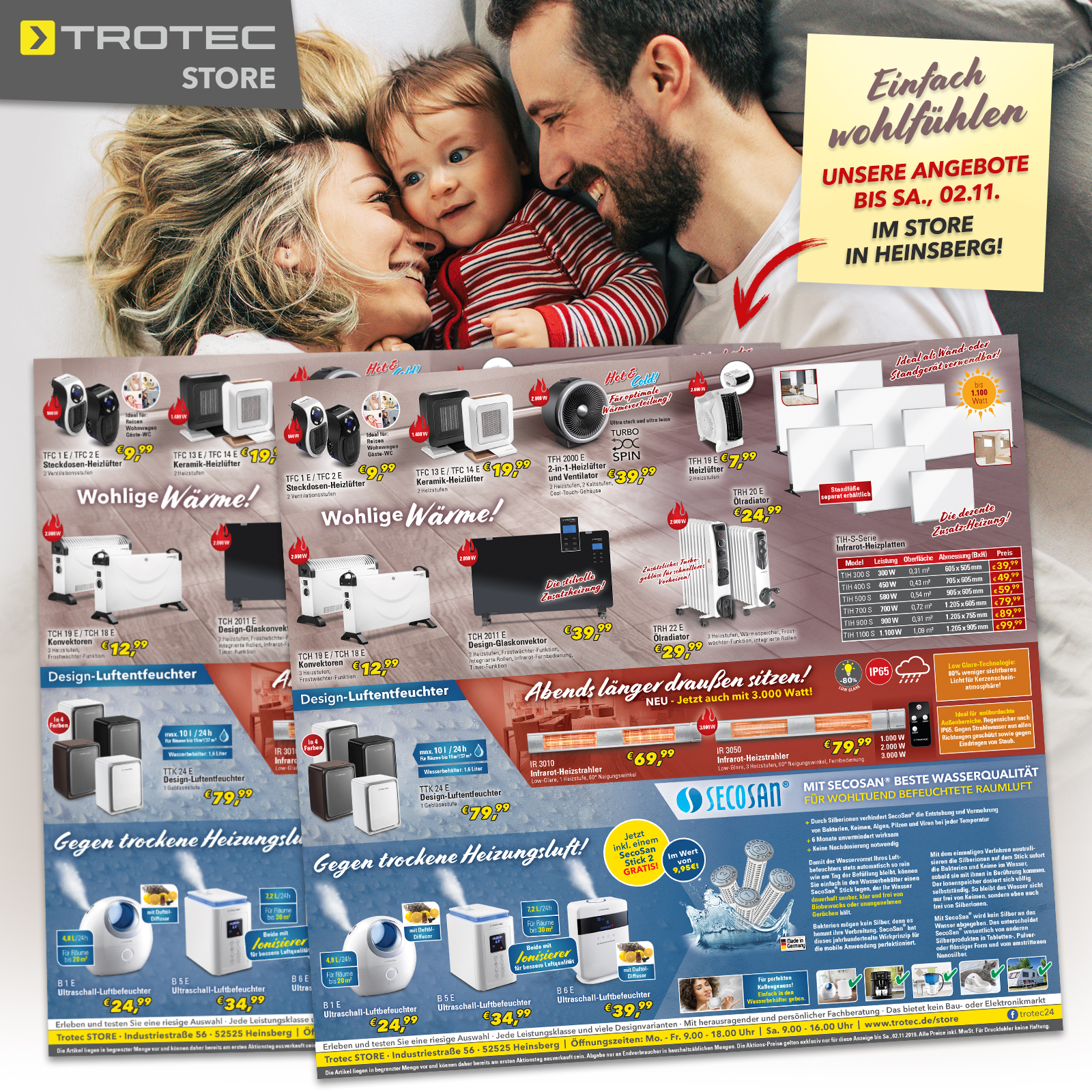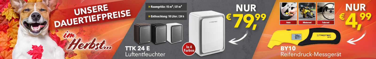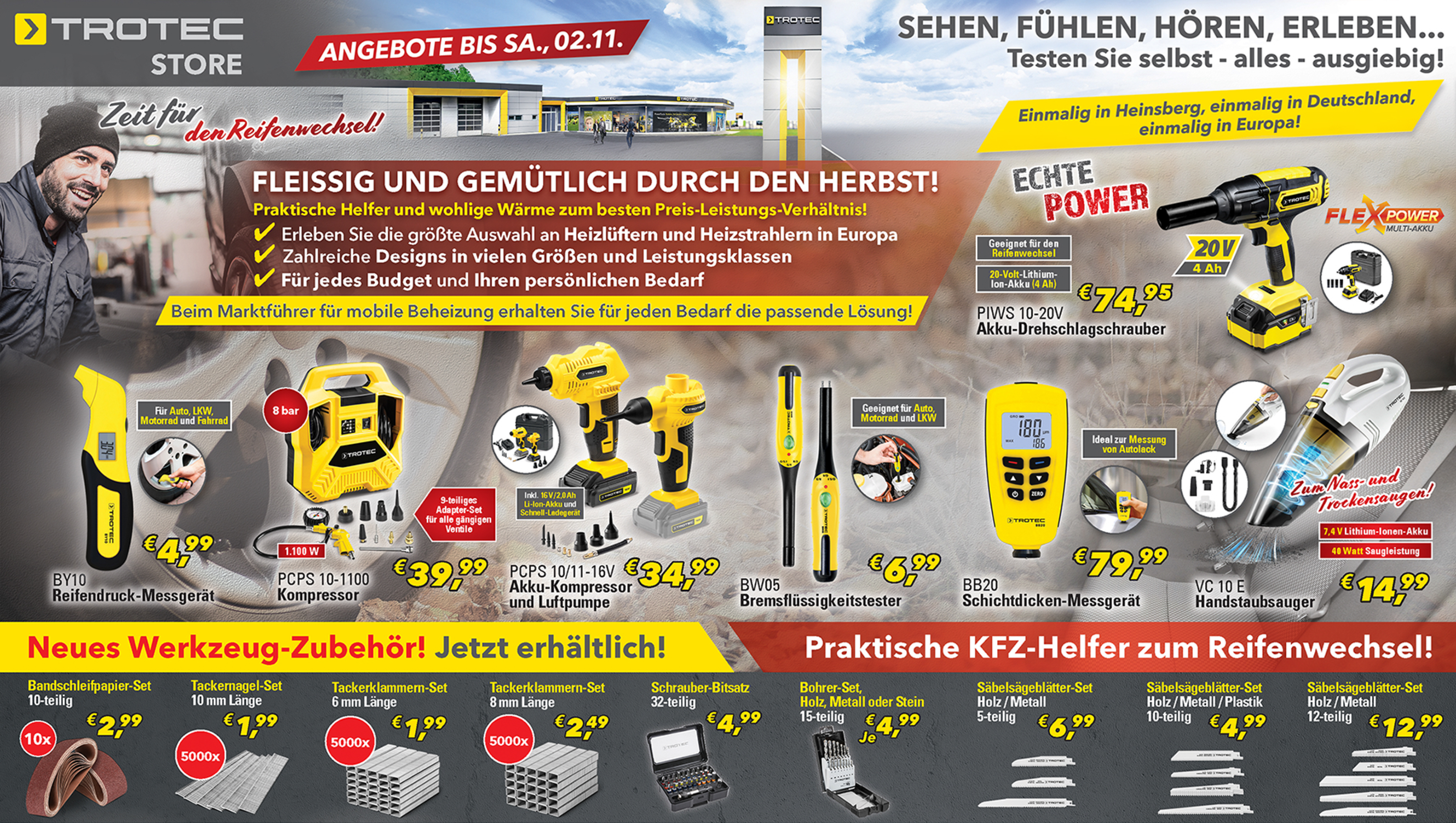 *Die Artikel liegen in begrenzter Menge vor und können daher bereits am ersten Aktionstag ausverkauft sein. Abgabe nur an Endverbraucher in haushaltsüblichen Mengen. Die Aktions-Preise sind exklusiv nur bis Sa., 02.11. bei Trotec vor Ort in Heinsberg gültig. Alle Preise inkl. MwSt. Für Schreibfehler keine Haftung.
